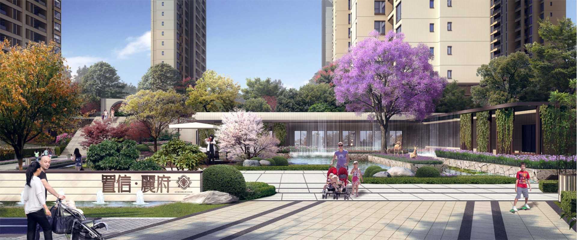 整个园区本着出则繁华、入则宁静的空间打造手法,将中国传统府邸的尊贵礼序和清雅禅意的自然空间融合到一起,通过对整体空间形态的把握,将“组团概念”和“院落概念”蕴涵其中,山水绿化通廊通而不透,台地错落有序,落花、流水、小桥、树林、石阶相衬,小径蜿蜒其间,形成活泼的绿化场地环境,定义景观风情为优雅公园庭院。